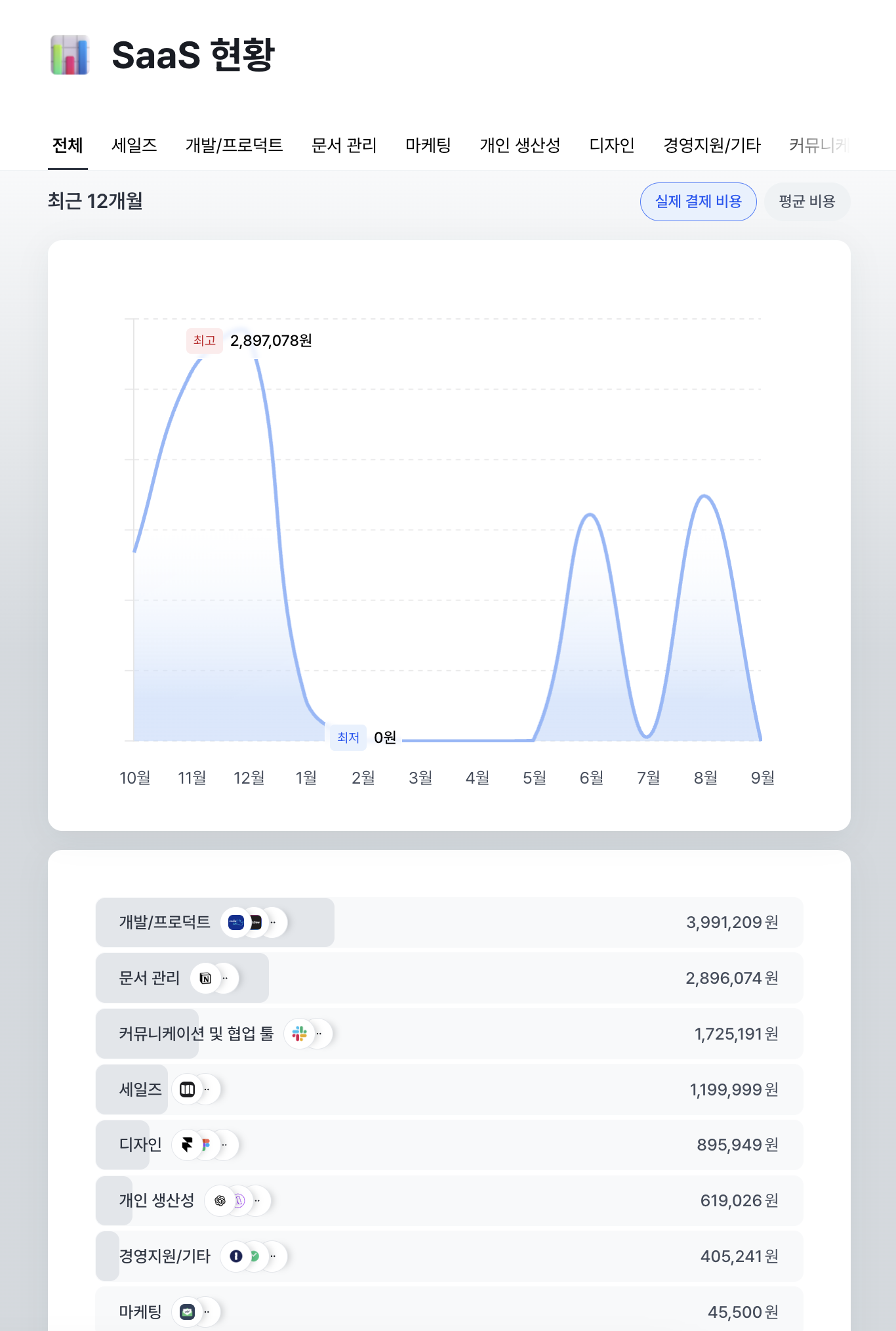 카테고리별 비용 그래프도 확인할 수 있습니다.